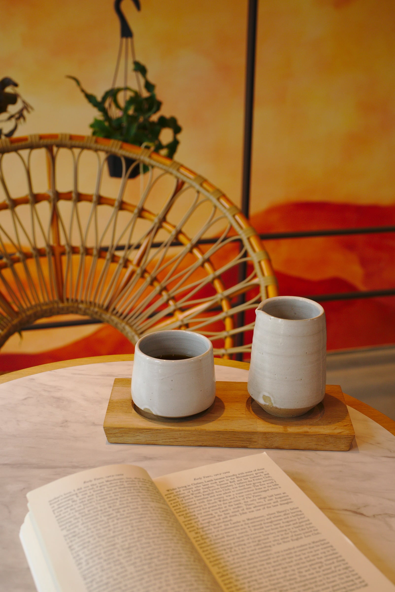 A hand-thrown mug fired in an oxidation atmosphere. Using red clay from Mashiko (Tochigi, Japan) with white glaze. Designed with and used in the Cafe, Woodberry Coffee Roasters, Tokyo Japan.